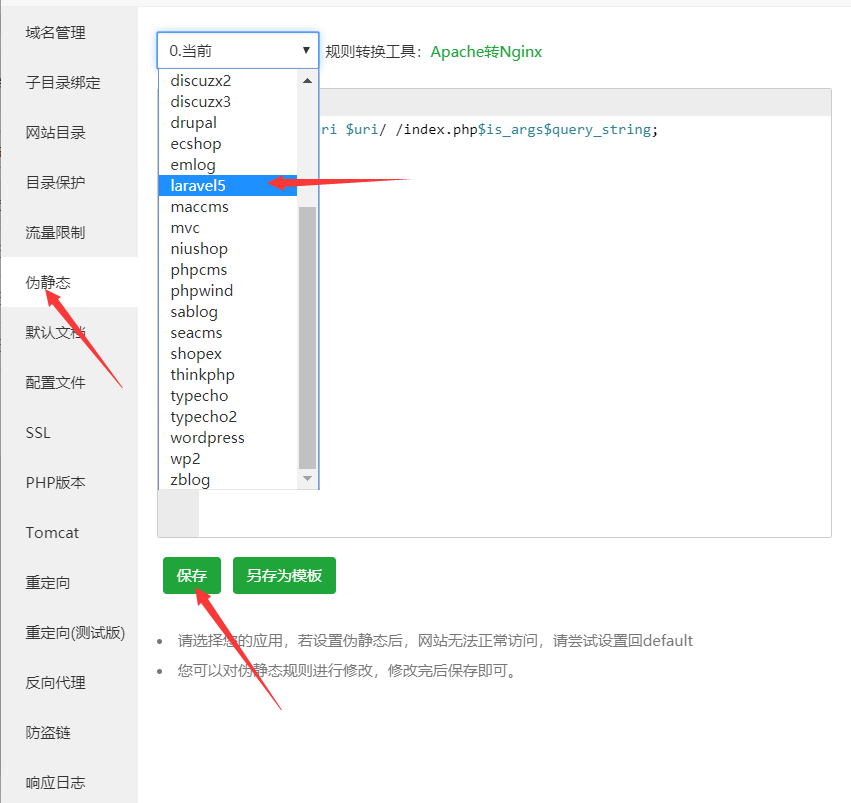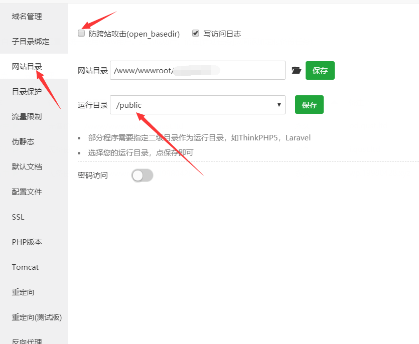 如图:勾选取消 防跨站攻击(open_basedir) 将站点的运行目录改为 public 别忘了保存