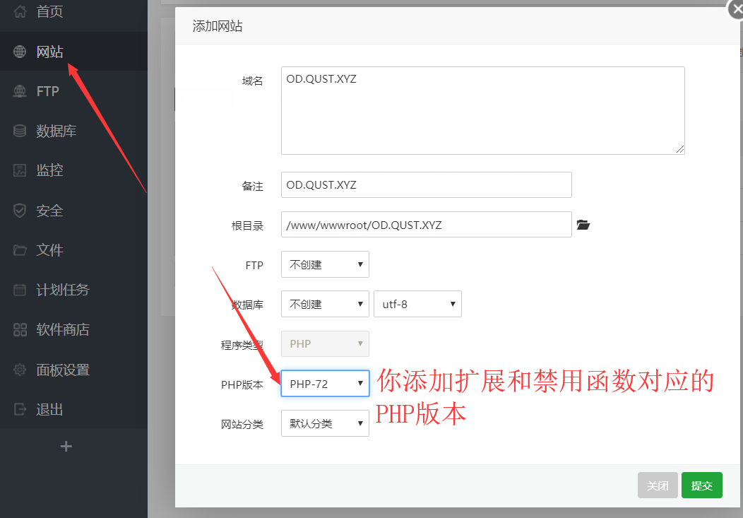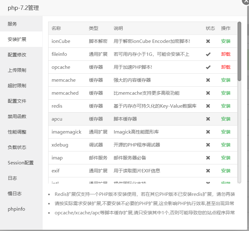 PHP 环境选择 7.1 以上,“软件商店”——找到你安装的PHP——设置——安装拓展。这里安装 fileinfo 扩展 并附带安装 opcache 扩展 以加速php运行,也可以安装 redis 和memcached 扩展。