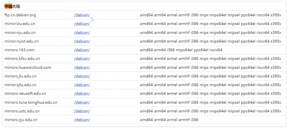 我们可以在Debian官方全球源列表中看到中国的源渠道,这里我整理8个常用的源。