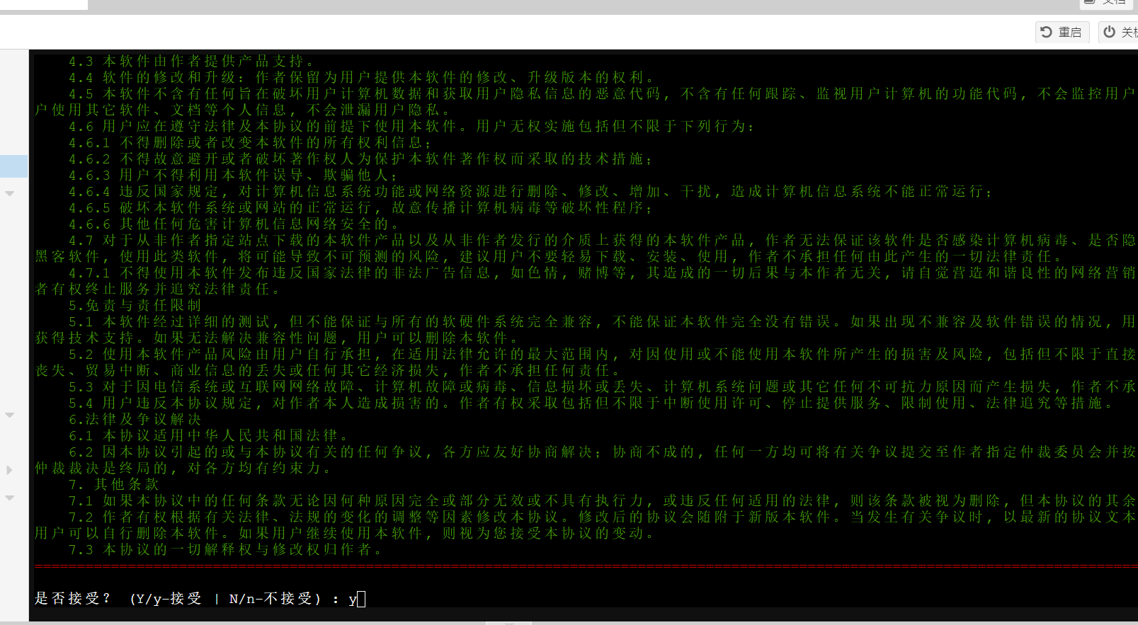 1、脚本加载成功出现使用协议,输入Y,然后继续按回车。