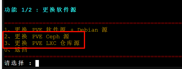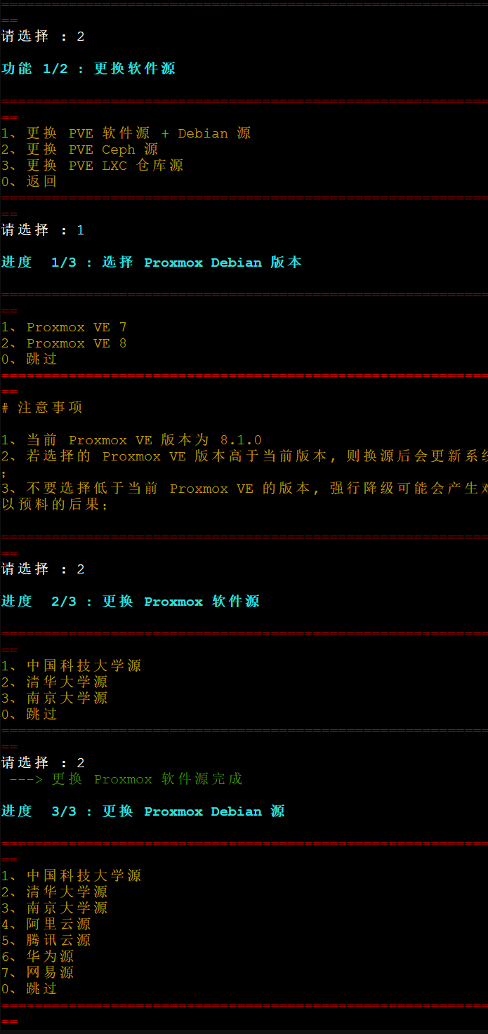 3、为了更方便了解脚本都干了什么,建议分步执行2\3\4\5\6,输入数字2,然后再输入1更换 PVE 软件源 + Debian 源,分别输入列表前面的数字选择PVE版本和软件源镜像站(不清楚的直接都选择清华大学源就行)。