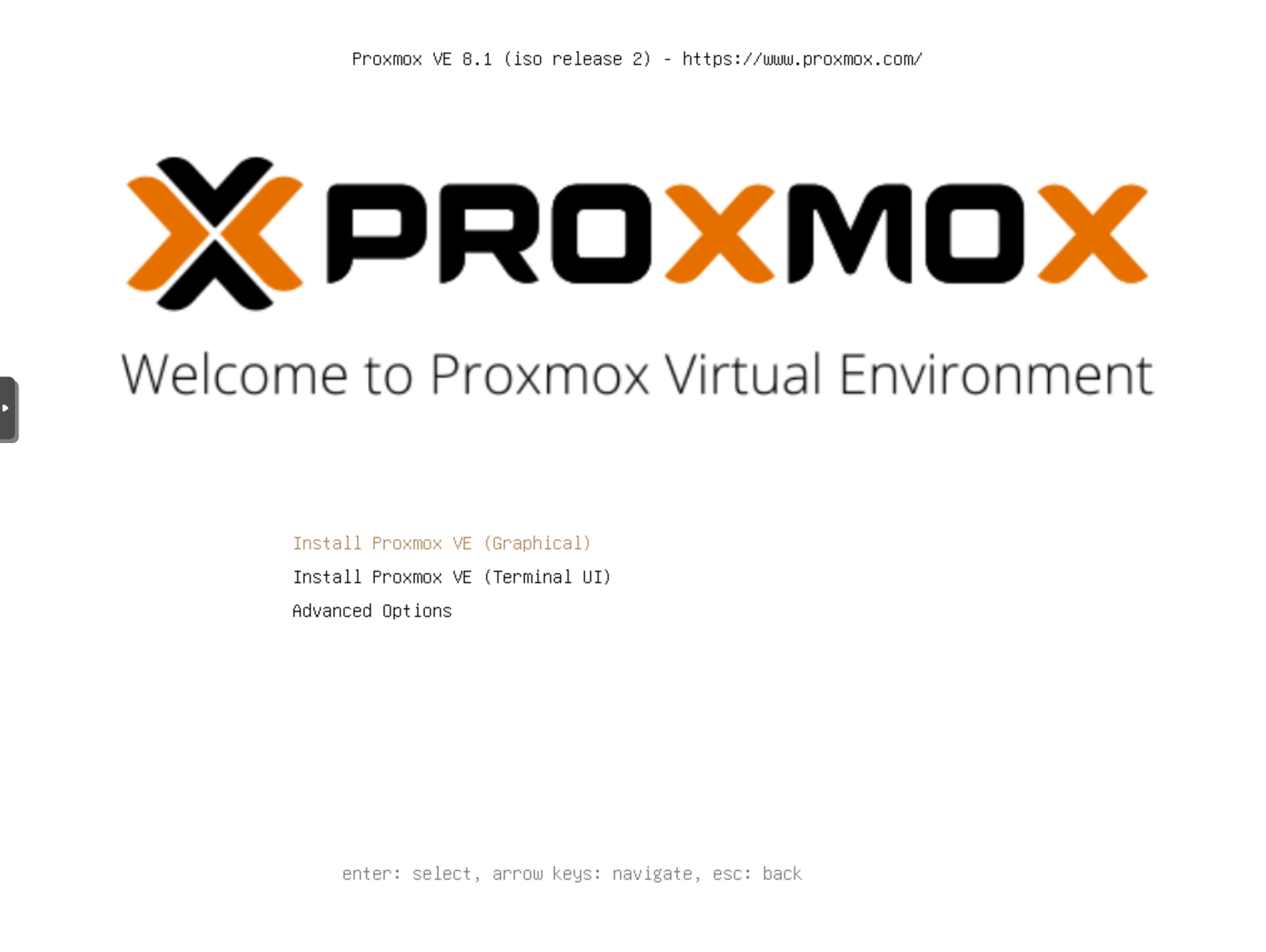 1、打开主机电源,不断按键盘F12按键(不同主机的U启动按键不同,请自行百度或者询问卖家)进入PVE安装页面,选择第一个Install Proxmox VE (Graphical),按回车。