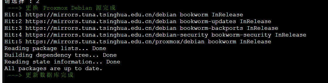 5、按照以上操作继续完成PVE Ceph 源 、PVE LXC 仓库源 的更新操作(==在Shell页面输入./pve\_source即可再次调出pve工具小技巧直接输入./pve然后按tab按键可自动补全后面==)。