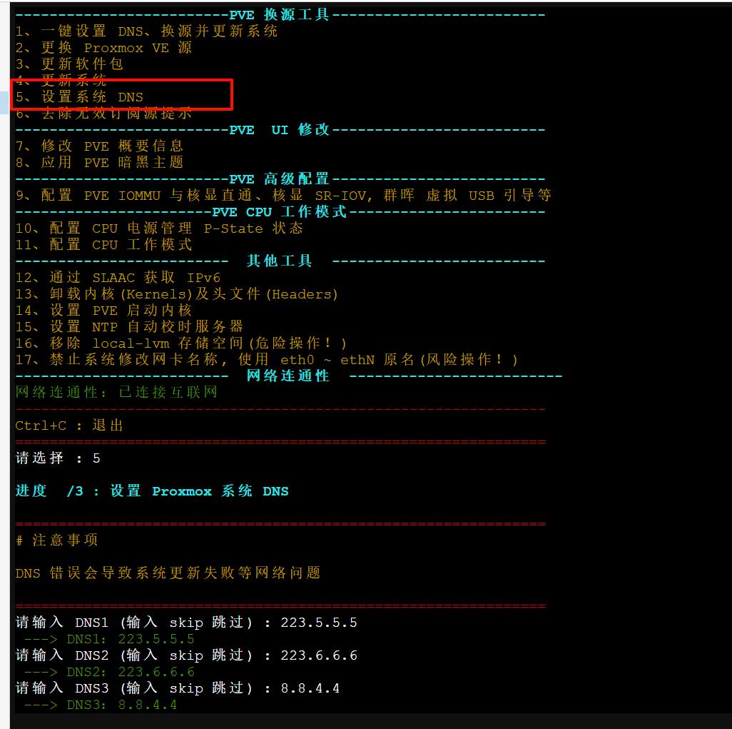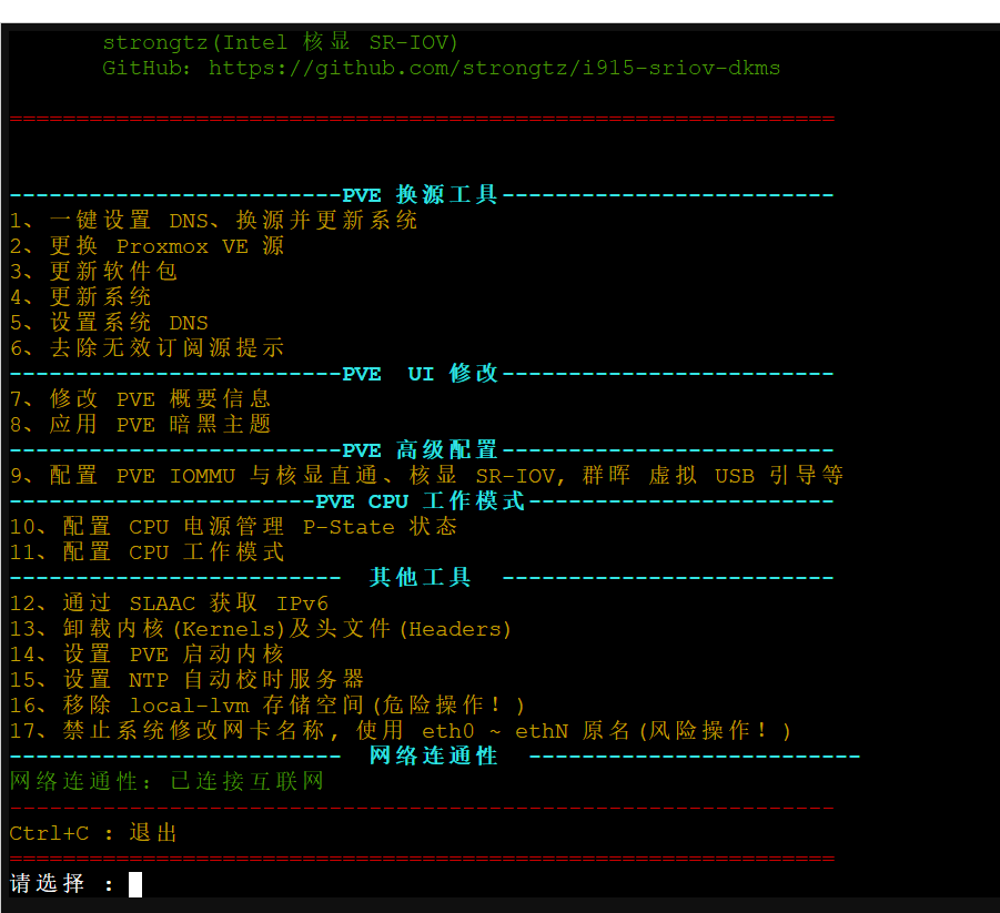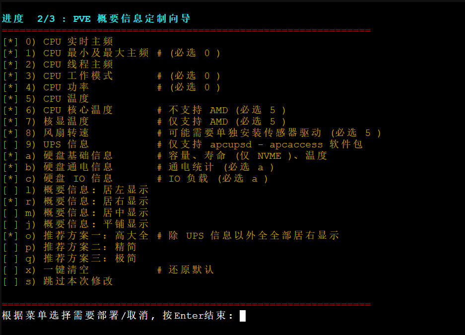 2、进入脚本优化选项,脚本覆盖了PVE的绝大部分必备优化选项,需要使用那个直接输入数字然后按回车即可。