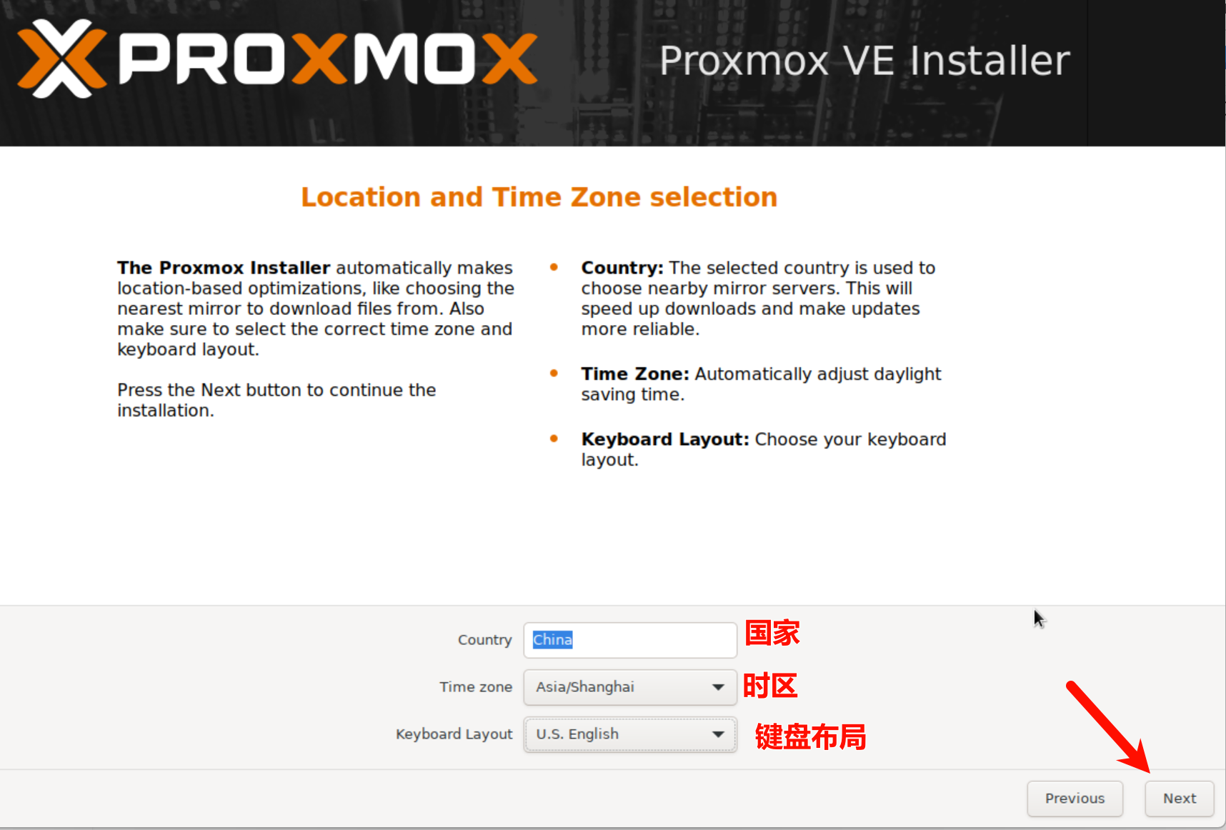 5、设置国家、时区、键盘布局,然后点击Next(下一步)。