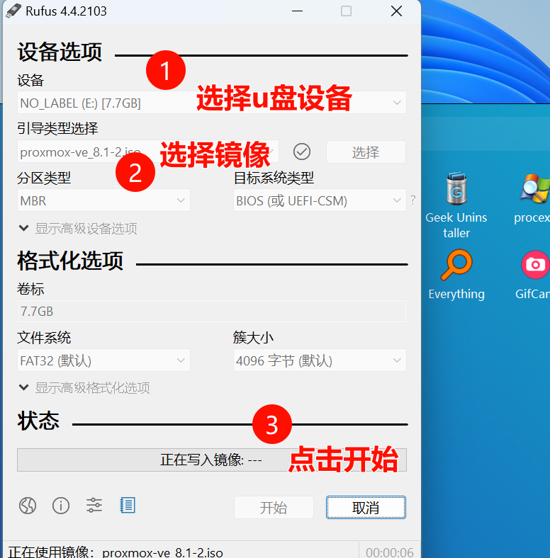 2、下载完成后直接双击运行,无需安装,设备中选择U盘,引导类型选择PVE镜像,然后点击开始,注意U盘中的原有数据会被格式化,重要数据记得备份。