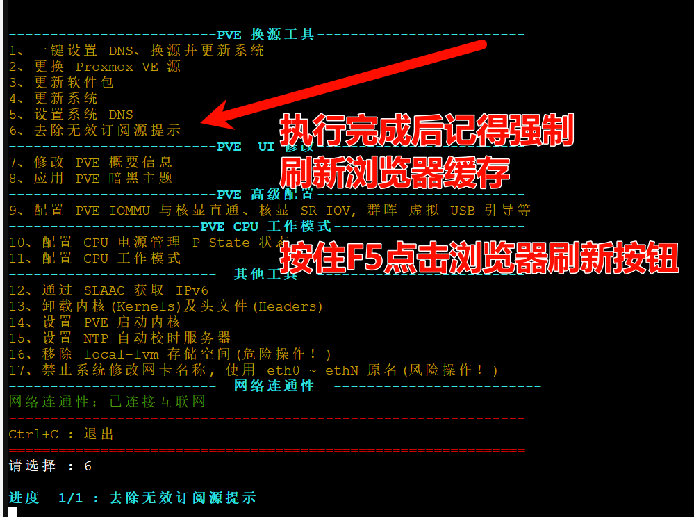 每次在登录pve的时候会弹出企业订阅提示,对于普通用户我们直接去除掉弹窗即可,登录PVE,在Shell窗口中输入./pve\_source,进入pve工具箱,输入6,系统会自动执行去除订阅脚本,脚本运行完成后请强制刷新浏览器缓存。