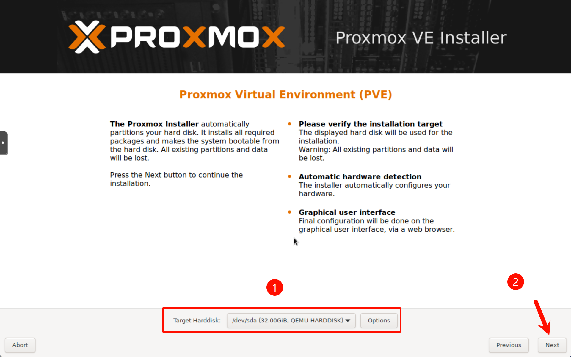4、选择pve安装的硬盘,然后继续点击Next(下一步)。