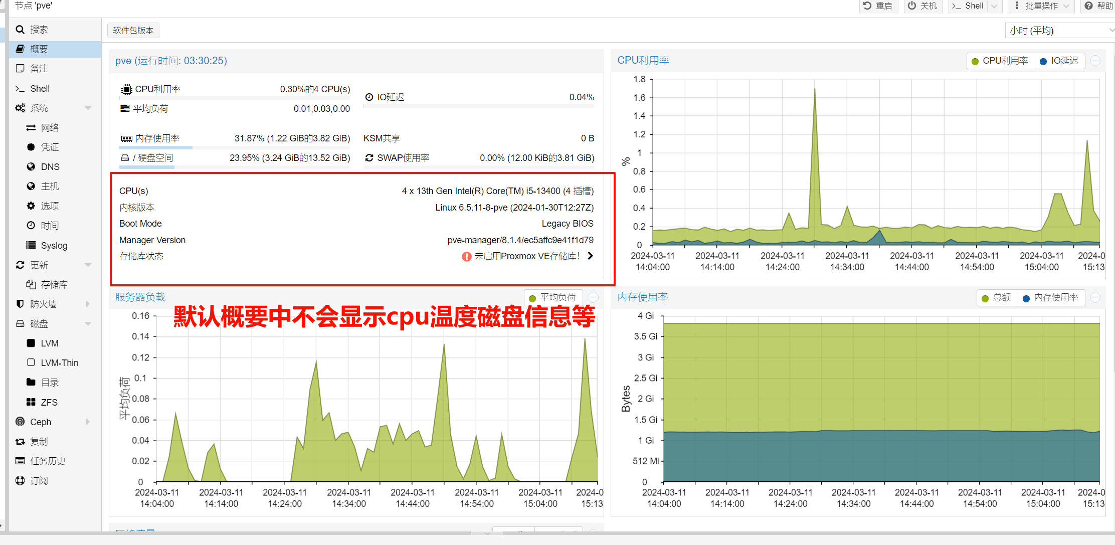 1、pve默认概要中不会显示cpu温度、硬盘信息等,通过pve工具箱可以修改信息概要页面,使其信息显示更加完善。