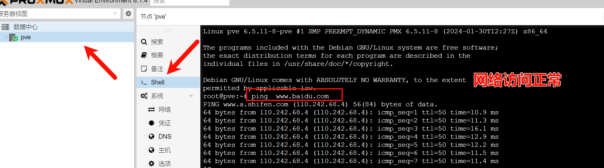 5、使用pve自带的shell工具来ping百度,测试网络是否正常,出现正确的ping值表示外网访问通畅。