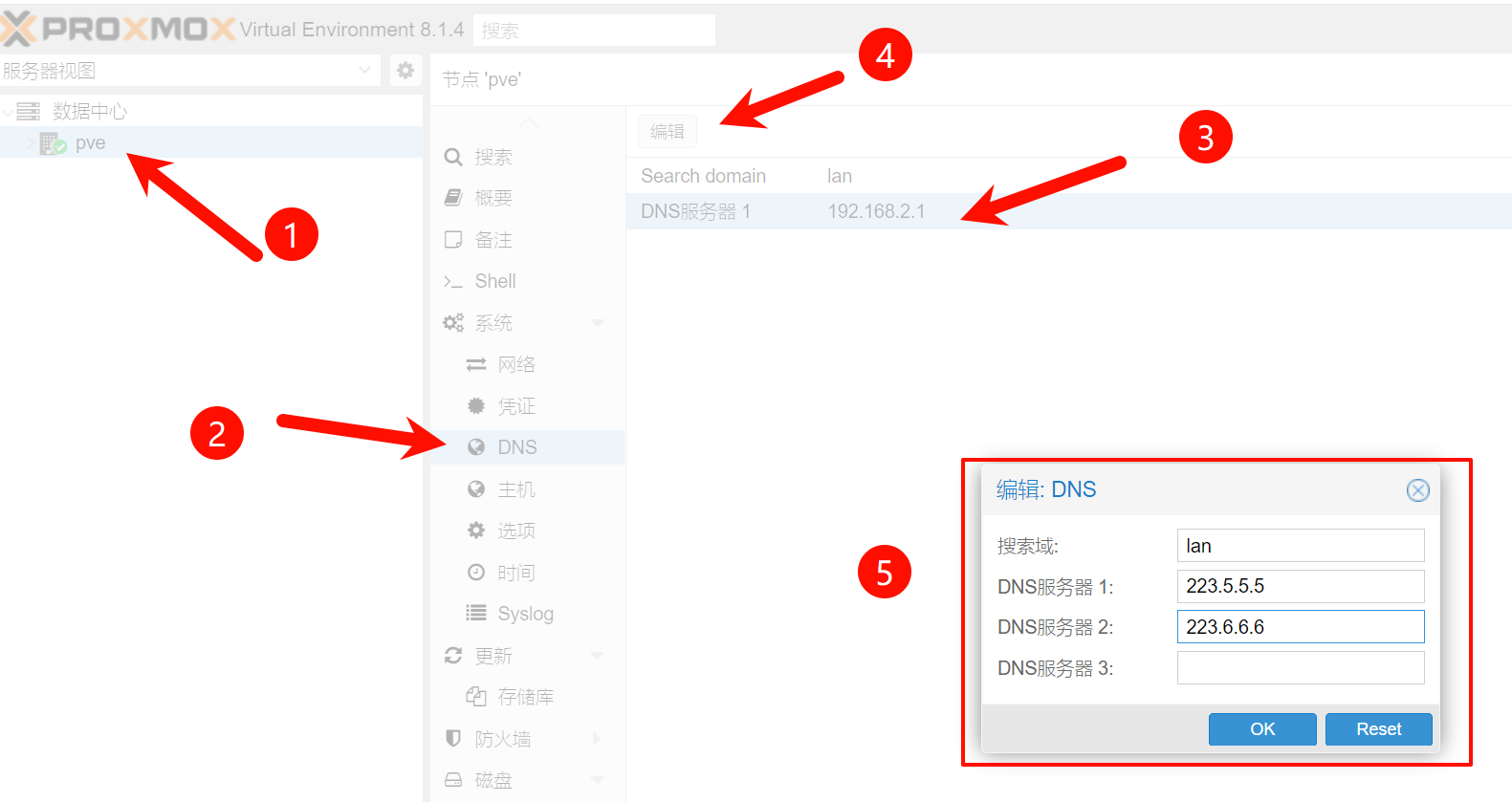 4、首先我们需要配置一下pve的dns来保证pve可以正确访问到网络,这里我使用了阿里云公共的DNS,223.5.5.5,223.6.6.6,然后点击ok。