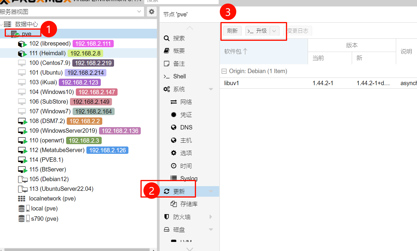 1、点击pve节点→更新→刷新→升级,既可以完成最新软件包和组件的升级。