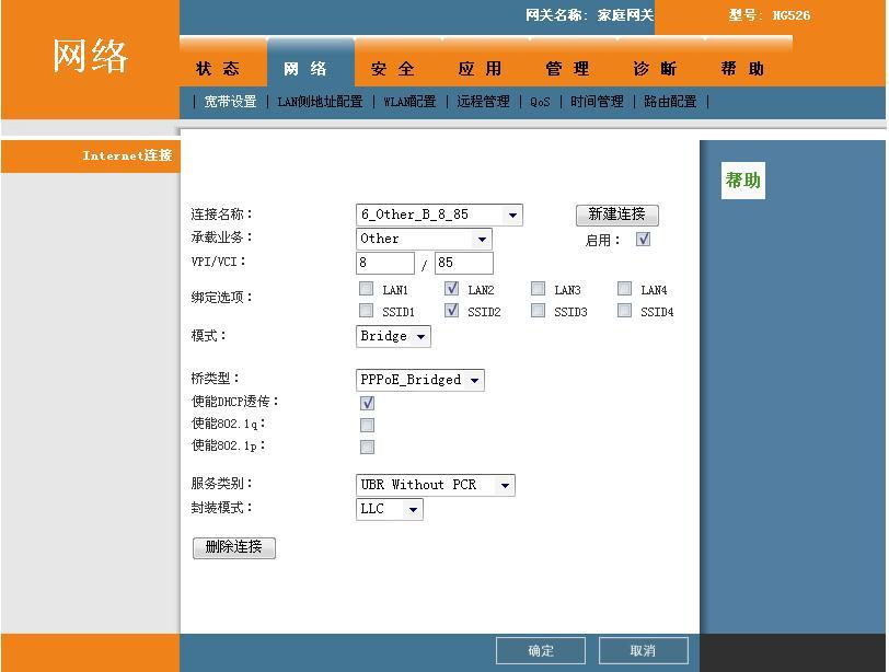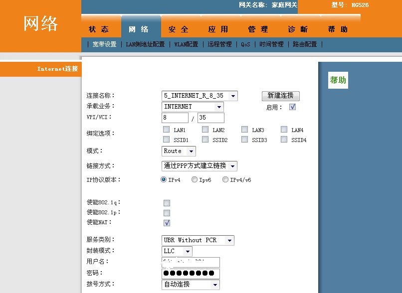 第二、点击“网络”进入网络设置,首先介绍下实现WIFI无线上网的方法,也就是让猫自动拨号的方法,新建链接,名字自己起,我们江苏电信VPI/VCI为8-35(外地的不一样自己可以到网上搜索),承载业务为INTERNET,绑定选项正常不用写,除非你需要指定端口才使用,下面的模式就选择“ROUTE”,链接方法为通过PPP链接,IP版本就为IPV4(目前的网络协议),使能NAT后面勾上(这个有什么用我也没有研究是原始的),服务类别选择“UBR WITHOUT PCR”,封装模式“LLC”,下面的用户名就是你的拨号账号与密码最后一个选项就自动拨号。这样就可以实现WIFI网络不需要拨号就可以直接上网。
